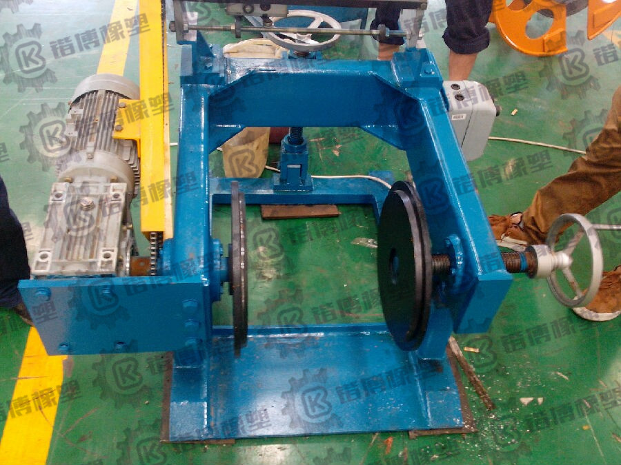 4.3.1?整機主框架為鋼板和型材焊接而成,通過一個伺服電機直聯蝸桿減速機帶動一對嚙合齒輪,以保證上下牽引輪同步轉動,每個牽引輪各帶動一條平皮帶傳動。上下有五對氣缸驅動壓緊裝置滾輪,使平皮帶壓緊電纜。平皮帶間距隨電纜直徑的不同而隨時變動,對于任何外徑的電纜,其中心高度不變。由氣動系統均勻的調整夾緊壓力和控制上下氣缸的氣源。有一單獨氣缸用來調節上下平皮帶張緊力。牽引裝置兩端均有井式導線裝置,以保證電纜中心位置不變。帶電子計米。